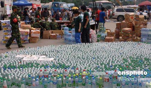 5月中旬, 來自四面八方的抗震救災(zāi)物資物品正在源源不斷地運(yùn)往四川地震災(zāi)區(qū)。都江堰市一個(gè)災(zāi)民聚集點(diǎn)里,一度趨于緊張的飲用水供應(yīng)已經(jīng)出現(xiàn)好轉(zhuǎn),各種不同品牌的瓶裝水被排列成地震災(zāi)區(qū)的巨大圖形,時(shí)刻警醒著人們。中新社發(fā) 鄒憲 攝
