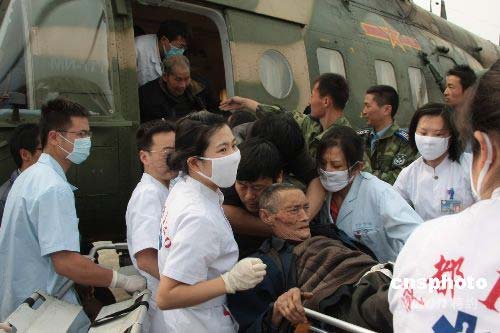 連日來,中國空軍連續(xù)出動軍用直升機到四川重災(zāi)區(qū)緊急搶運危重傷員,及時送到成都進(jìn)行救治,為挽救幸存者生命贏得時間。圖為5月15日,空軍航空兵某搜救團(tuán)轉(zhuǎn)移傷員的情景。中新社發(fā) 譚超 攝