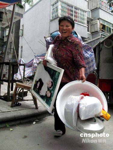 四川都江堰市蒲陽大道兩側居民建筑在大地震中造成致命性的破壞,已經不能住人,不久將要徹底拆除。圖為一名婦女在余震較輕時,冒險回家取出生活用品,告別家園。中新社發(fā) 鄒憲 攝