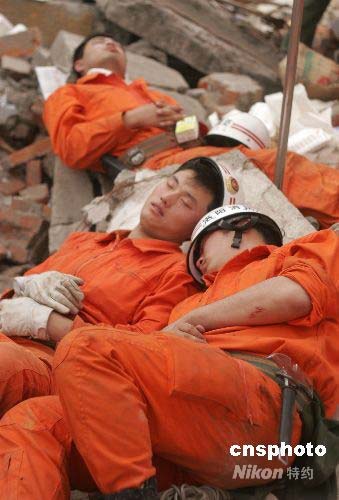 5月17日,在四川省什邡市鎣華鎮(zhèn)、紅白鎮(zhèn)等搶險(xiǎn)現(xiàn)場(chǎng),連續(xù)作戰(zhàn)的洛陽(yáng)消防搶險(xiǎn)救援突擊隊(duì)隊(duì)員們躺在瓦礫上小憩片刻。在四川地震災(zāi)區(qū),解放軍、武警、公安、邊防、消防官兵以及民兵、醫(yī)療救護(hù)人員和志愿者們,不怕危險(xiǎn),不畏疲勞,為搶救每一條寶貴的生命連續(xù)奮戰(zhàn)。他們是最可愛的人!中新社發(fā) 張曉理 攝