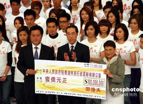 五月十七日晚﹐香港無(wú)線電視舉行《眾志成城抗震救災(zāi)》大型籌款活動(dòng)﹐呼吁全港市民踴躍募捐﹐賑濟(jì)四川地震災(zāi)區(qū)。圖為電視廣播有限公司副主席方逸華女士(前右一)代表邵逸夫爵士捐款一億港幣,中聯(lián)辦副主任李剛(前左一)等出席。中新社發(fā) 武仲林 攝