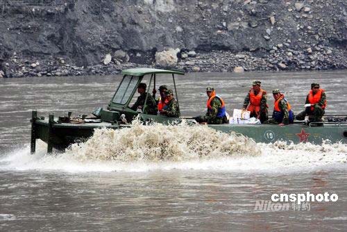 5月17日,成都軍區(qū)某部出動軍用船只運送四川地震災區(qū)的災民。中新社發(fā) 張雷 攝
