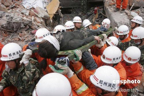 5月17日18時(shí)18分,四川省什邡市鎣華鎮(zhèn)鎣華實(shí)業(yè)有限公司31歲女工卞剛芬在震后本廠綜合大樓廢墟下被埋124小時(shí)后,經(jīng)河南消防搶險(xiǎn)救援突擊隊(duì)連續(xù)31小時(shí)的艱苦營(yíng)救后奇跡生還,她意識(shí)清醒,對(duì)周圍的人們說著“感謝”。中新社發(fā) 張曉理 攝