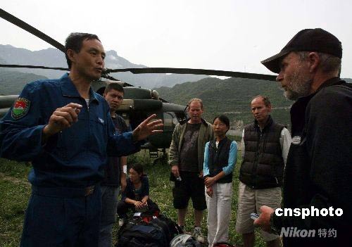 五月十八日,三名美國游客和三名澳大利亞游客以及一名丹麥游客從茂縣登上救援的成都軍區(qū)陸軍航空兵某團的直升飛機,搭乘王牌飛行員姜機長的飛機撤回“天府之國”四川省會成都。這批來九寨溝的游客被困在地震災(zāi)區(qū)己經(jīng)七天,之前先通過軍方的海事衛(wèi)星電話,分別向海外親人報告了平安。 中新社發(fā) 賈國榮 攝