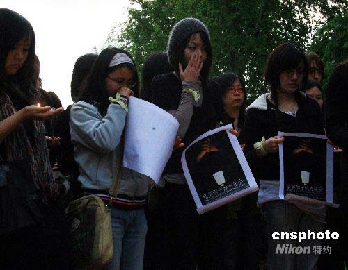 當(dāng)?shù)貢r(shí)間18日晚,數(shù)百名留英中國學(xué)生和學(xué)者聚集到倫敦大學(xué)亞非學(xué)院,在燭光中為四川地震災(zāi)區(qū)的人民祈禱與祝福。圖為悼念死難者時(shí),手捧蠟燭的留學(xué)生們潸然淚下。中新社發(fā) 李鵬 攝