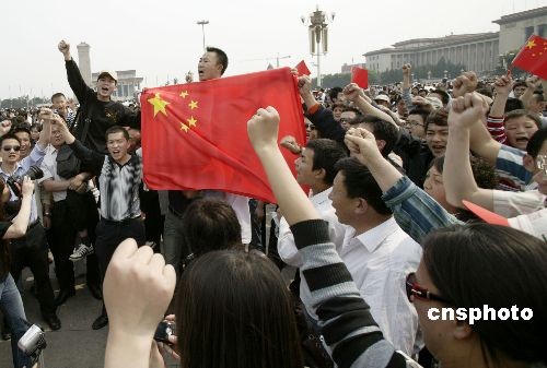 2008年5月19日14時(shí)31分,默哀結(jié)束后,在北京天安門(mén)廣場(chǎng)的近萬(wàn)名民眾仍然聚集在一起,手持國(guó)旗和菊花,高喊:“加油四川!加油中國(guó)!”中新社發(fā) 李剛 攝