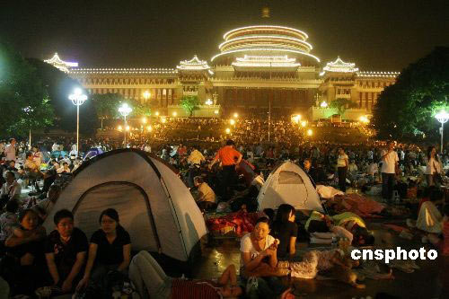 5月20日凌晨,重慶人民廣場內(nèi),大批當(dāng)?shù)厥忻裨诖舜罱◣づ襁^夜。19日晚21時(shí)30分許,重慶市人民政府發(fā)布信息稱,19日至20日,在汶川震區(qū)附近有可能發(fā)生6至7級余震,重慶各地將會(huì)有明顯震感。并提醒廣大市民注意安全,按防震知識(shí)做好防范工作,注意相互幫助、維護(hù)公共秩序。信息發(fā)布后,大批當(dāng)?shù)厥忻耖_始聚集廣場、平地等開闊地帶過夜。中新社發(fā) 郭晉嘉 攝
