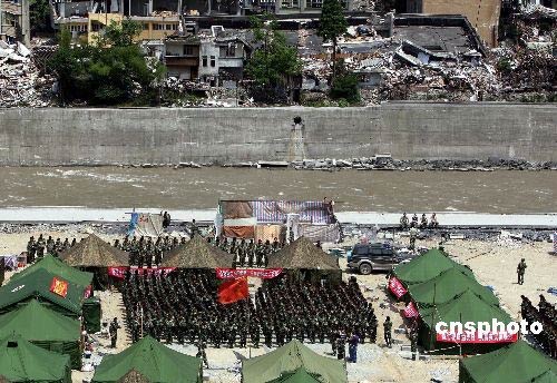 5月19日下午14時(shí)28分,四川省汶川大地震核心重災(zāi)區(qū)映秀鎮(zhèn)一派肅穆,背靠成片的廢墟與湍急的岷江,率先進(jìn)入該鎮(zhèn)救險(xiǎn)的武警四川總隊(duì)官兵面對(duì)國旗默哀三分鐘。中新社發(fā) 任晨鳴 攝