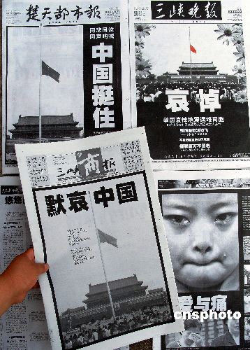2008年5月20日是全國(guó)哀悼日的第二天,湖北《三峽商報(bào)》、《三峽晚報(bào)》、《楚天都市報(bào)》等多家報(bào)紙?jiān)陬^版整版推出“默哀”圖片報(bào)道,向在四川大地震中遇難的同胞致哀。
