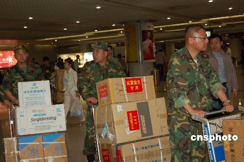 5月19日深夜,部隊(duì)官兵攜帶救援藥品到達(dá)四川成都雙流國(guó)際機(jī)場(chǎng),為救治四川汶川大地震受傷人員添力。