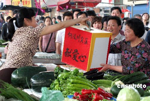 5月21日,浙江省德清縣個(gè)私協(xié)會(huì)乾元分會(huì)和乾元市場(chǎng)開(kāi)發(fā)服務(wù)所工作人員協(xié)同市場(chǎng)各行業(yè)的經(jīng)營(yíng)組長(zhǎng),發(fā)起向地震災(zāi)區(qū)人民獻(xiàn)愛(ài)心活動(dòng),得到市場(chǎng)內(nèi)近300名經(jīng)營(yíng)戶的積極支持和參與,現(xiàn)場(chǎng)共收到愛(ài)心捐款一萬(wàn)六千余元。四川的災(zāi)情牽動(dòng)著浙江省德清縣長(zhǎng)橋農(nóng)貿(mào)市場(chǎng)廣大經(jīng)營(yíng)戶的心,截至發(fā)稿時(shí)止,廣大經(jīng)營(yíng)戶捐款活動(dòng)還在繼續(xù)。