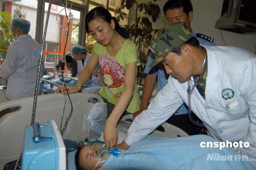 5月21日,在四川汶川5·12大地震中被救出后向解放軍“行隊禮”的北川3歲男孩郎錚在綿陽市解放軍某醫(yī)院成功完成斷臂續(xù)接手術(shù)。給小朗錚主刀的手術(shù)醫(yī)生、來自第四軍醫(yī)大學(xué)的張教授說郎錚手掌饒神經(jīng)雖已損傷,但三個月后會恢復(fù)。目前朗錚正在綿陽市解放軍某醫(yī)院繼續(xù)接受治療。中新社發(fā) 成和平 攝
