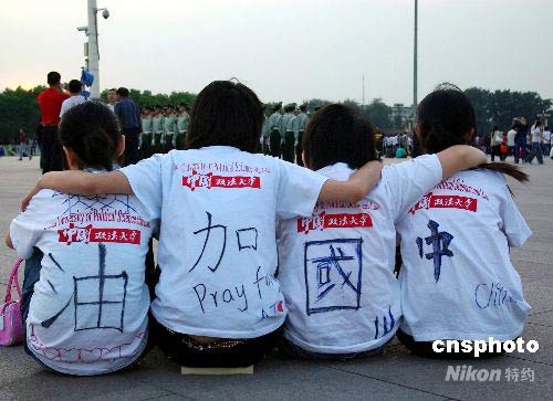 5月21日是全國哀悼日第三天,眾多群眾自發(fā)來到天安門廣場(chǎng)觀看降旗儀式。許多“80后”青年身穿印有“中國挺起”、“中國加油”的文化衫,手持白菊為汶川大地震遇難同胞做最后送別。中新社發(fā) 九州 攝