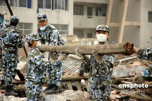5月22日,正在四川地震災區(qū)執(zhí)行救災任務的海軍陸戰(zhàn)隊某旅兩棲偵察女兵隊的姑娘們走進什邡市師古鎮(zhèn)的村莊和村民住戶,幫助受災民眾清理廢墟,重建家園。中新社發(fā) 李唐 攝