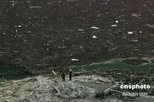 汶川大地震發(fā)生以后,水利地質(zhì)人員乘直升飛機降落到北川唐家山堰塞湖,檢測水位上漲和污染危情,嚴(yán)密監(jiān)測由于一座大山的崩塌堵塞河道形成的堰塞湖。中新社發(fā) 賈國榮 攝
