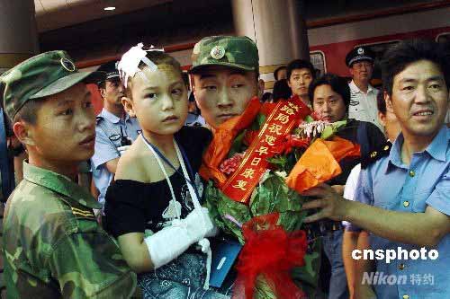 五月二十五日,一名來(lái)自四川廣元的小傷員被兩軍解放軍戰(zhàn)士抱起。當(dāng)日上午十一時(shí)零三分,滿載著二百七十二名汶川大地震受傷人員的廣元至鄭州“運(yùn)送災(zāi)區(qū)受傷親人”專列抵達(dá)鄭州火車站,他們將在當(dāng)?shù)鼐偶抑付ㄡt(yī)院接受治療。中新社發(fā) 李志全 攝