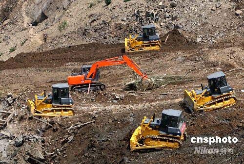 5月26日11時許,俄羅斯米—26大型運輸機運送的大型機械在四川唐家山堰塞湖排險。據(jù)悉,他們將24小時不間斷工作。中新社發(fā) 趙振清 攝