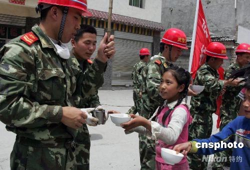 武警交通直屬工程部經(jīng)過6天奮戰(zhàn),5月27日終于打通了臥龍至“孤島”耿達(dá)的“生命線”,各種給養(yǎng)補給車輛開進(jìn)被與世隔絕的重災(zāi)區(qū)耿達(dá)鎮(zhèn),當(dāng)?shù)孛癖姼兄x武警官兵。中新社發(fā) 江胡 劉亞軍 攝