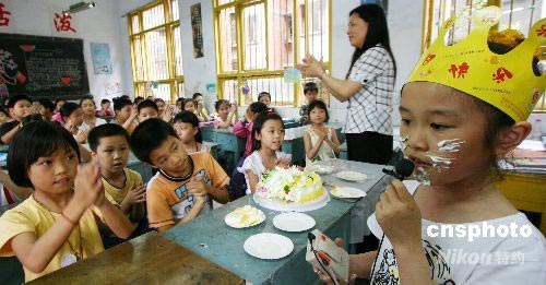 5月28日,重慶市永川區(qū)萱花小學(xué)三.三班全體同學(xué)為來自四川省江油災(zāi)區(qū)的段明陽過了個(gè)簡單而隆重的生日,同學(xué)們分批次地把自己親手做的生日禮物送給段明陽,并祝她生日快樂。段明陽向全班同學(xué)清唱了一首《裝扮藍(lán)色的地球》表謝意,并一一把生日蛋糕喂給同學(xué)們,期望能盡早地融入到新的集體里。中新社發(fā) 陳仕川 攝
