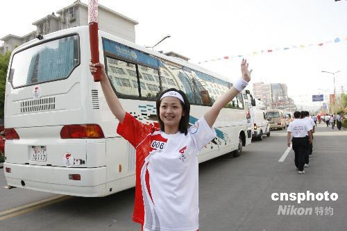 5月29日,奧運圣火在“能源之都”淮南傳遞。圖為與白血病魔頑強斗爭的女大學生,奧運火炬手孫潔,她高舉火炬并為四川加油。她說她的生命奇跡不僅來自她的堅強毅力,更是來自社會的愛。她告訴四川人民,我們一起加油。 中新社發(fā) 張婭子 攝