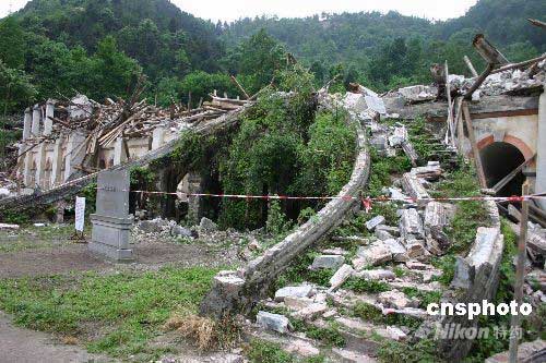 領(lǐng)報修院是全國重點文物保護單位,位于彭州市白鹿鎮(zhèn)以北2.5公里回水村,距成都77公里,俗稱“白鹿上書院”。在汶川8.0級大地震發(fā)生后,這座有100多年歷史的老教堂坍塌。中新社發(fā) 楊杰 攝