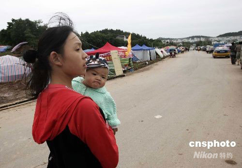 5月29日,受唐家山堰塞湖潰壩險情影響,綿陽市游仙區(qū)沈家壩東街社區(qū)居民陸續(xù)撤離至富樂山高地,一位年輕的媽媽抱著孩子來到這里準(zhǔn)備開始避險生活。中新社發(fā) 杜洋 攝