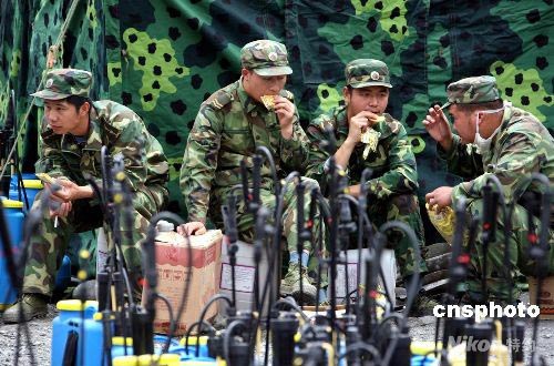 5月29日,參加抗震救災(zāi)的中國軍隊繼續(xù)對汶川大地震重災(zāi)區(qū)汶川縣映秀鎮(zhèn)不間斷進行補給救援,而在映秀鎮(zhèn)的官兵中午飯只能嚼餅干充饑。中新社發(fā) 張雷 攝