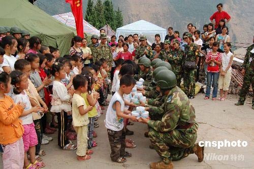 5月31日,在四川綿竹市金花小學校址的廢墟旁邊,38名在地震中幸存的小學生和中國空降兵“上甘嶺特功八連”所在團的官兵們一起迎接“六一”兒童節(jié)。地震災害發(fā)生以后,該團是首支進駐金花鎮(zhèn)執(zhí)行抗震救災任務的部隊。在“六一”兒童節(jié)來臨之際,官兵們和孩子們一起在小學倒塌的廢墟邊舉行升旗儀式,唱起國歌。官兵們還向孩子們贈送用自發(fā)捐款購買的學習和生活用品。中新社發(fā) 陳翊 攝