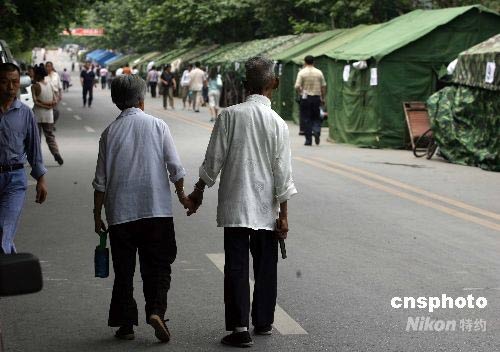 六月一日,唐家山堰塞湖避險(xiǎn)疏散預(yù)案三分之一潰壩方案涉及的下游群眾,已全部撤離到安全地帶。 一對(duì)年過古稀的老人牽手在綿陽(yáng)市游仙區(qū)綿山路上新建的疏散安置點(diǎn)悠閑散步。中新社發(fā) 王瑤 攝