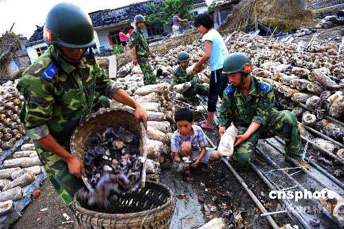 六月三日,空降兵士兵在四川什邡幫助百姓搶收木耳。四川什邡是重要的木耳生產(chǎn)基地,地震中損失慘重。五月十二日發(fā)生地震后八小時(shí)即空降至該地的空降兵部隊(duì),目前正開(kāi)展幫助民眾重建家園工作,兩天內(nèi)他們已幫助農(nóng)民搶收木耳九千多公斤,以盡力減少地震帶來(lái)的經(jīng)濟(jì)損失。中新社發(fā) 慎重 攝