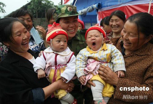 6月4日,在地震中受到傷害的平武縣石坎鄉(xiāng)五個(gè)月大的雙胞胎兄弟李杰、李彬,經(jīng)過濟(jì)南軍區(qū)第159醫(yī)院野戰(zhàn)醫(yī)療隊(duì)軍醫(yī)的精心呵護(hù),恢復(fù)了健康。在受困群眾救助站,雙胞胎兄弟成為一對(duì)耀眼的“小明星”。中新社發(fā) 畢華明 攝