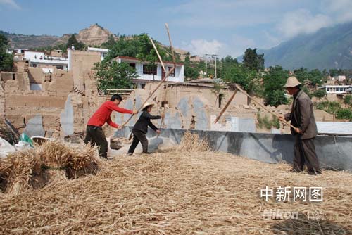 圖:甘肅隴南市地震受災(zāi)群眾打麥?zhǔn)占Z