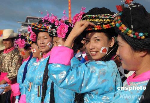 圖:"女兒國(guó)"的摩梭女歡慶奧運(yùn)圣火到來