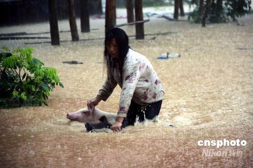 從六月十二日晚至十三日下午,廣東省由于受強(qiáng)降雨云系影響,二十七個(gè)市縣下起暴雨和大暴雨,其中惠州為特大暴雨,該市惠城區(qū)、惠陽區(qū)、大亞灣經(jīng)濟(jì)技術(shù)開發(fā)區(qū)等地區(qū)內(nèi)澇嚴(yán)重,經(jīng)濟(jì)損失較大。圖為惠州市惠城區(qū)三棟鎮(zhèn)官橋村一女士的養(yǎng)豬場(chǎng)被淹,一百多頭豬被洪水沖走,她正在奮力救回了一頭小豬。中新社發(fā) 宋秀杰 攝