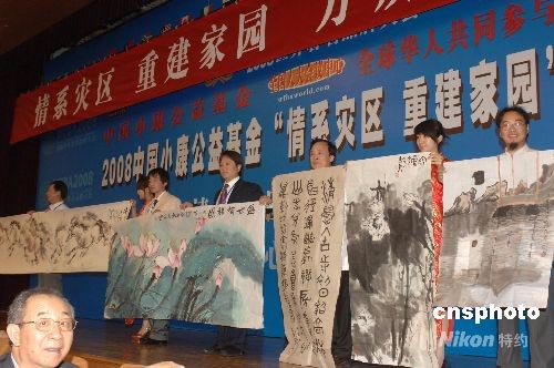 6月15日,百名畫家在北京全國人大會議中心出席2008中國小康公益基金“情系災(zāi)區(qū)、重建家園”推動大會暨中國當(dāng)代百名畫家賑災(zāi)義捐獻愛心活動。該活動是由文化部中華社會文化基金會、中國小康公益基金、美中經(jīng)貿(mào)投資總商會、世界著名品牌大會等單位共同主辦!爸袊】倒婊稹庇晌幕恐腥A社會文化發(fā)展基金會組建。中新社發(fā) 鄒憲 攝