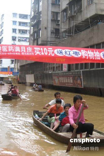 六月十六日,西江水已超警戒水位六點五米的洪峰流經廣東封開后,封開舊城區(qū)仍被水淹,居民出行只能以舟代步。中新社發(fā) 黃耀輝 攝