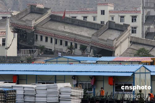 廣東省定點(diǎn)援建四川汶川大地震震中地區(qū)映秀鎮(zhèn),六月以來廣東省援建隊(duì)一直在該鎮(zhèn)漩口中學(xué)即將清理的廢墟旁開闊地?fù)尳ɑ顒?dòng)木屋區(qū)。中新社發(fā) 賈國榮 攝