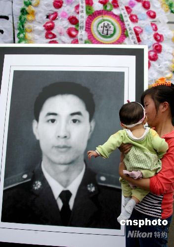 6月21日,在都江堰市胥家鎮(zhèn)抗震英雄武文斌烈士的靈堂前,各地群眾敬獻(xiàn)的花圈已達(dá)兩千余個,數(shù)千民眾自發(fā)來到抗震英雄武文斌烈士的靈堂前進(jìn)行悼念。26歲的濟(jì)南軍區(qū)“鐵軍”部隊炮兵指揮連二期士官武文斌,因連日救災(zāi)勞累,于6月18日4時45分犧牲。6月21日,濟(jì)南軍區(qū)某集團(tuán)軍作出決定,為犧牲在抗震救災(zāi)第一線的某紅軍師實習(xí)士官學(xué)員武文斌追記一等功,并批準(zhǔn)為烈士。中新社發(fā) 曾憲平 攝