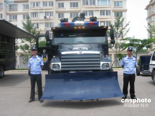 為了確保奧運(yùn)會(huì)帆船帆板比賽的安全進(jìn)行,青島公安部門引進(jìn)了排爆機(jī)器人、反恐水炮車等一大批具有國際一流水平的反恐防爆裝備。圖為公安部門引進(jìn)的反恐水炮車,目前全國僅有三輛。中新社發(fā) 李進(jìn)梅 攝
