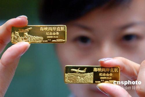 7月1日,由中國國家博物館藝術(shù)品開發(fā)中心權(quán)威監(jiān)制國道黃金發(fā)行的“海峽兩岸直航紀(jì)念金條”在北京亮相。2008年6月13日上午,海峽兩岸關(guān)系協(xié)會會長陳云林與海峽交流基金會董事長江丙坤在釣魚臺國賓館簽署《海峽兩岸包機(jī)會談紀(jì)要》,兩岸周末包機(jī)將于7月4日起正式啟航。黃金全國僅限量2008套,全套包括2根25克AU9999金條。第一根金條的主畫面是空中客機(jī)、中國大熊貓及“團(tuán)團(tuán)圓圓”字樣;第二根金條主畫面是空中客機(jī)和臺灣阿里山風(fēng)景。金條背面是關(guān)于《海峽兩岸包機(jī)會談紀(jì)要》的簽署情況概述。中新社發(fā) 鄒憲 攝