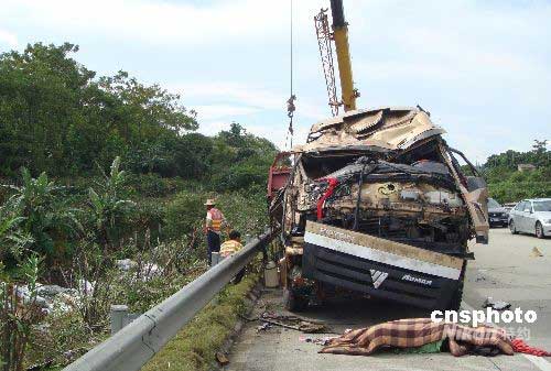 7月2日7時(shí)30分,GO5O國(guó)道廣西都南高速公路距離武鳴服務(wù)區(qū)五公里處,發(fā)生一起交通事故,造成一死一傷。一輛車牌號(hào)為川J22030的大貨車由都安開(kāi)往南寧方向,在廣西都南高速公路距離武鳴服務(wù)區(qū)五公里處撞至公路護(hù)欄后沖出路外,翻下護(hù)坡,造成一人當(dāng)場(chǎng)死亡。中新社發(fā) 黃艷梅 攝