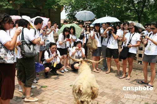 7月7日,由海外18個(gè)國家和地區(qū)的243名優(yōu)秀華人子弟組成的“第九屆海外杰青匯中華訪問團(tuán)”來到陜西楊凌,參觀了西北農(nóng)林科技大學(xué)國家重點(diǎn)實(shí)驗(yàn)室----人工模擬降雨大廳和該校培育的世界首批成年體細(xì)胞克隆山羊“陽陽”以及世界上最大的胚胎克隆羊群體。據(jù)了解,“海外杰青匯中華” 訪問團(tuán)是以幫助海外華裔大學(xué)生“了解現(xiàn)代中國 認(rèn)識(shí)文化根源”為宗旨的活動(dòng)。訪問團(tuán)除了在陜西參觀后還將赴北京、天津和上海等地參觀。 中新社發(fā) 支勇平 攝