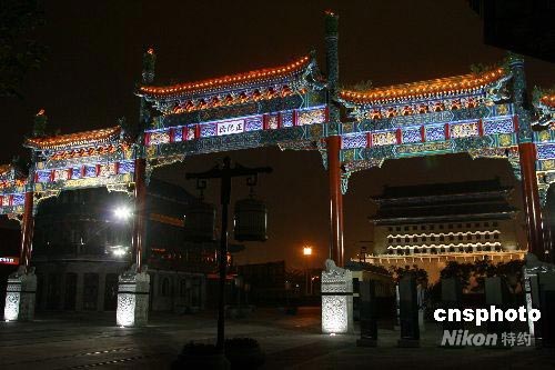 7月8日晚,前門大街北端的五牌樓“亮燈”調試,燈光映襯下,大氣恢宏的五牌樓成為市民駐足觀賞的夜景。據了解,前門大街基本修繕完工,各項功能性設施都已進入調試完善階段,其中包括五牌樓的夜景照明系統(tǒng)。中新社發(fā) 富田 攝