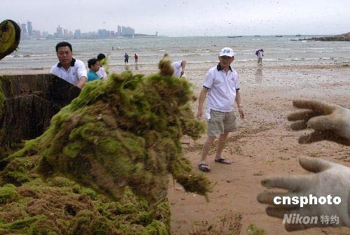 7月19日,青島第三海水浴場,志愿者們正在清理殘余的滸苔。自5月下旬以來,黃海中部海域出現(xiàn)大規(guī)模漂浮的滸苔,在青島市近海海域形成了大片聚集區(qū)。為了及時清除滸苔,努力將滸苔的不利影響降到最低,青島市近日出動千余艘各類船只,穿梭在滸苔飄浮的海面,在海上進行拉網(wǎng)式打撈。在大片的滸苔聚集區(qū),采用圍油欄攔截滸苔,使清除滸苔的的速度明顯提高,確保在規(guī)定的時間內(nèi)清除滸苔,為舉辦奧帆賽創(chuàng)造良好的海域環(huán)境。 中新社發(fā) 廖攀 攝