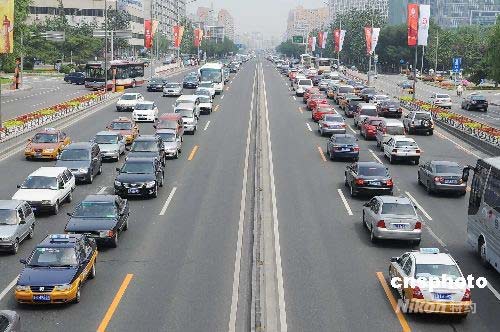 從7月20日起,北京全面實(shí)施奧運(yùn)交通管制,所有車輛將按照單雙號(hào)行駛,“禁飛令”、“錯(cuò)時(shí)上下班”等奧運(yùn)保障措施等也同時(shí)實(shí)施。隨著8月8日北京奧運(yùn)會(huì)開幕腳步越來越近,北京正式進(jìn)入“奧運(yùn)時(shí)間”。圖為用黃白線劃分的奧運(yùn)專用車道內(nèi)側(cè)車道從當(dāng)日起啟用。中新社發(fā) 陳文 攝