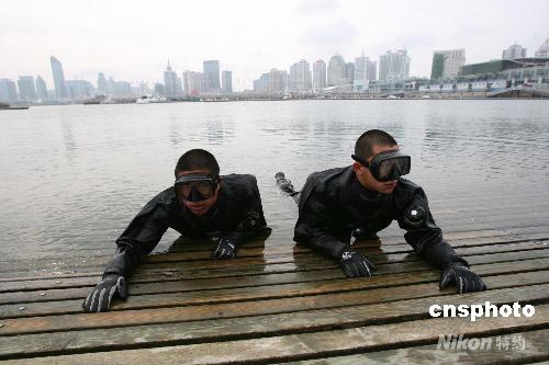 暑期,青島邊防支隊(duì)駐奧帆中心的特勤官兵在奧運(yùn)會帆船比賽場地進(jìn)行適應(yīng)性潛水訓(xùn)練,在貼近實(shí)戰(zhàn)狀態(tài)下提高隊(duì)員處置突發(fā)事件等能力。第29屆奧運(yùn)會帆船帆板比賽將于2008年8月9日至23日在青島國際帆船中心及周邊水域舉行。 中新社發(fā) 王瑤 攝
