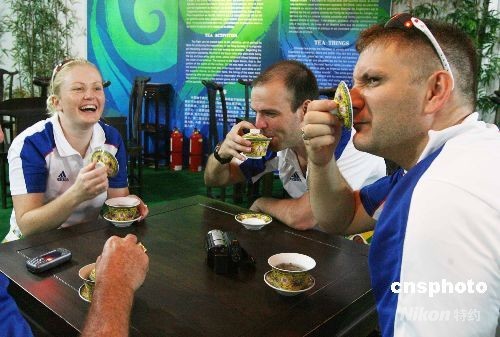 7月28日,英國跳水運動員以十分夸張的表情,在北京奧運村國際區(qū)輕松品味中國茶文化。中新社發(fā) 武仲林 攝