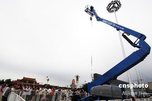 7月29日,美國一家電視臺動用云梯空中拍攝天安門廣場迎奧運盛況。據(jù)報道,北京在奧運會期間對天安門廣場上的直播報道亮起綠燈,不過僅限于獲得奧運轉(zhuǎn)播權(quán)的官方電視公司。根據(jù)相關(guān)協(xié)議,外媒直播報道時段被安排在早上6點到10點以及晚上9點到11點。其他媒體也可以在天安門廣場進行報道,但不能直播。 中新社發(fā) 王東明 攝