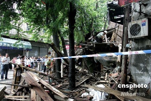 7月30日清晨,受今年第八號(hào)臺(tái)風(fēng)“鳳凰”影響,福州市臺(tái)江區(qū)隆平巷一兩層木屋在雨中倒塌,當(dāng)時(shí)屋內(nèi)有一家3口,其中父子兩人受傷。中新社發(fā) 小小 攝
