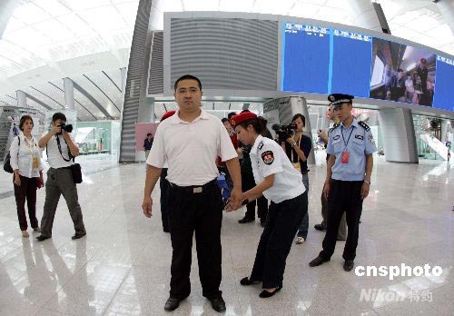 北京奧運會的重點配套工程——京津城際鐵路8月1日將正式運營。在始發(fā)站北京南站,車站反恐防爆設立“五道防線”,即車站廣場及周邊地區(qū)的巡查,強化車站出入通道管理,嚴格進站旅客攜帶物品的安檢,加強候車室、售票廳、行李房、行李寄存處的管理,加強列車安檢。圖為安檢人員進行通車前的最后安保演練。中新社發(fā) 杜燕 攝